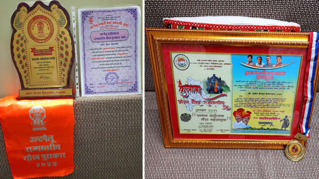 तसेच भाई जगताप मित्र मंडळ रायगड, माजी आमदार स्व. मधुकर ठाकूर चॅरिटेबल ट्रस्ट अलिबाग, ॲड. उमेश ठाकूर मित्र मंडळ संस्थेतर्फे दि. 3/1/25 रोजी कवी अनंत देवघरकर ह्या़ंना ‘कुलाबा जीवन गौरव राज्यस्तरीय पुरस्कार 2025’ने गौरवण्यात आले. अनंत देवघरकर यांनी पाच दिवसात 2 पुरस्कार प्राप्त केल्यामुळे त्यांचे सर्वत्र कौतुक होत आहे.