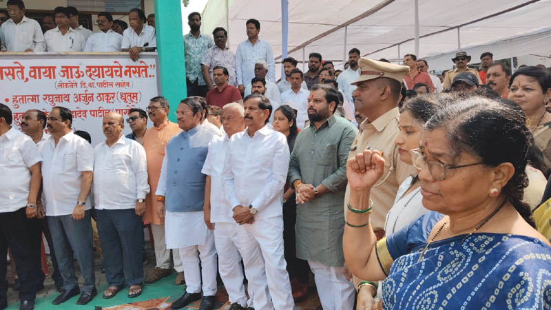 हुतात्म्यांना आदरांजली वाहण्यासाठी गुरुवारी (दि. १६) जासई येथील हुतात्मा स्मारकात सर्वपक्षीय अभिवादन सोहळा पार पडला. या अभिवादन सोहळ्याप्रसंगी राज्याचे वनमंत्री गणेश नाईक, लोकनेते तथा माजी खासदार रामशेठ ठाकूर, खासदार श्रीरंग बारणे, आ. महेश बालदी,आ. प्रशांत ठाकूर,आ. विक्रांत पाटील, माजी खासदार तथा माजी महापौर संजीव नाईक, माजी आमदार मनोहरशेठ भोईर, माजी आमदार बाळाराम पाटील, कामगार नेते महेंद्र घरत, कामगार नेते भूषण पाटील, माजी पनवेल नगराध्यक्ष जे. एम. म्हात्रे, जेएनपीए कामगार विश्वस्त दिनेश पाटील,र वींद्र पाटील, दिबा पुत्र अतुल पाटील, माजी सभापती नरेश घरत, प्रदेश सरचिटणीस संतोष घरत, जगदीश गायकवाड, प्रितम म्हात्रे, परेश ठाकूर, शिवसेना जिल्हाप्रमुख अतुल भगत, सीमा घरत, भावनाताई घाणेकर, सरपंच संतोष घरत, वाय. टी. देशमुख, माजी सरपंच जितेंद्र म्हात्रे, चंद्रकांत घरत, तहसीलदार डॉ. उध्दव कदम, सरपंच सुचिता प्रेमनाथ ठाकूर, कामगार नेते सुरेश पाटील, सामाजिक कार्यकर्त्या हेमलता पाटील, आजी-माजी सरपंच, उपसरपंच आदि मान्यवरांसह नागरिक उपस्थित होते. यावेळी हुतात्म्यांना पुष्पचक्र वाहून अभिवादन करण्यात आले तसेच लोकनेते दिबांच्या पुतळ्यास वनमंत्री गणेश नाईक यांनी पुष्पहार अर्पण करून आदरांजली वाहिली. यावेळी पनवेल येथील महात्मा फुले महाविद्यालयातील एनसीसीच्या विद्यार्थ्यांनी हुतात्म्यांना मानवंदना दिली.