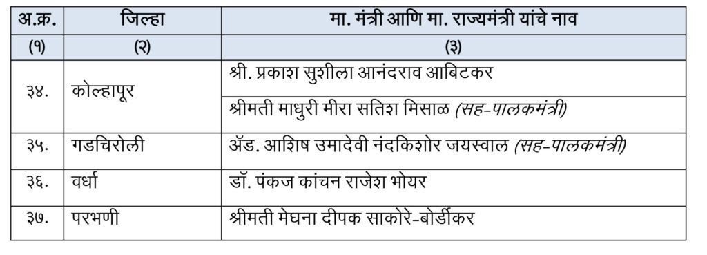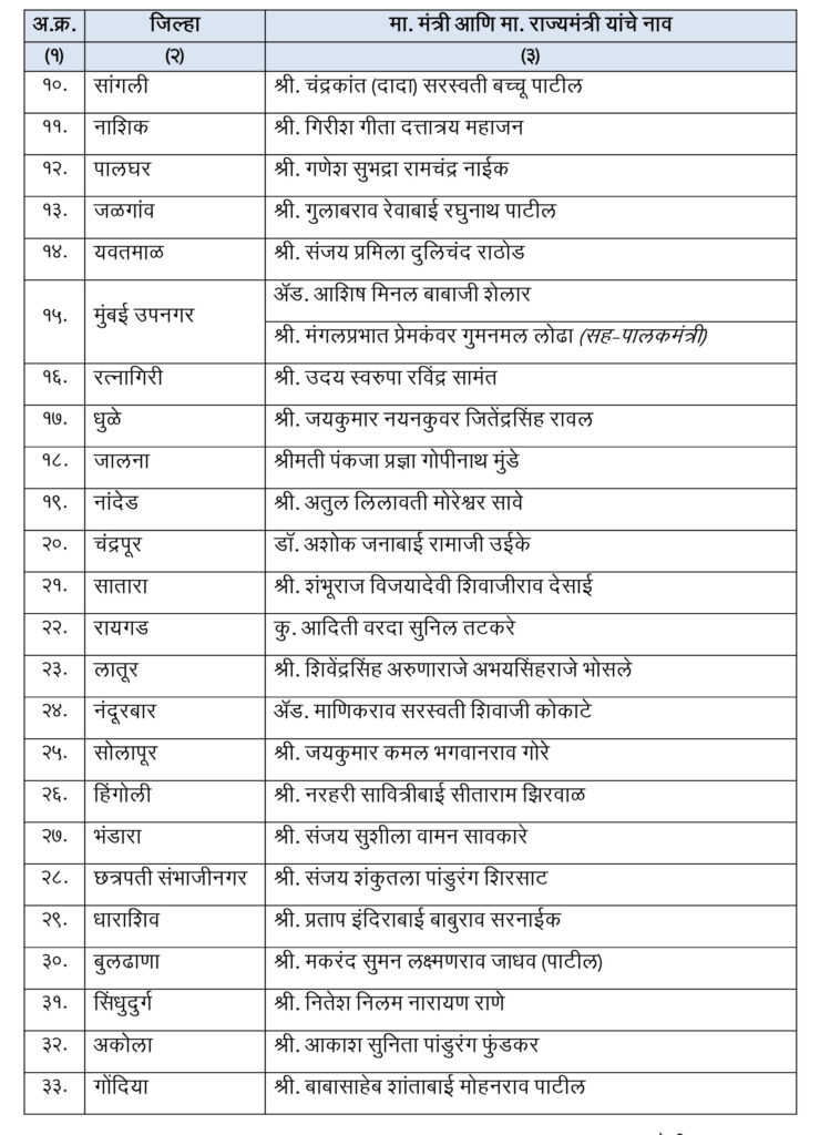 मुंबई : विधानसभेच्या निवडणुकीमध्ये महायुतीला लोकांनी प्रचंड असे बहुमत दिले. त्यानंतर मुख्यमंत्री म्हणून देवेंद्र फडणवीस यांनी शपथ घेतली तर उपमुख्यमंत्री म्हणून एकनाथ शिंदे आणि अजित पवार यांनी शपथ घेतली. मंत्रिमंडळ विस्तार देखील करण्यात आला. गेल्या काही दिवसांपासून पालकमंत्र्यांच्या नावांची घोषणा करण्यात आली नव्हती. आता नुकताच पालकमंत्र्यांच्या नावाची यादी ही जाहीर करण्यात आलीये. अनेकांची वर्णी लागली आहे तर संतोष देशमुख प्रकरणात निकटवर्तीय वाल्मिक कराडचे नाव आल्याने धनंजय मुंडे यांना पालकमंत्रिपदापासून दूर ठेवण्याचा निर्णय अजित पवारांनी घेतलाय. यासोबतच अनेक नवीन चेहऱ्यांना पालकमंत्री म्हणून काम करण्याची संधी मिळालीये.