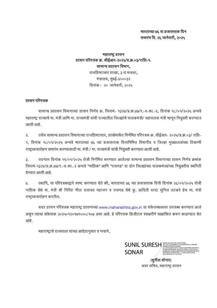रायगड व नाशिक जिल्ह्याच्या पालकमंत्री पदाचा वाद आणि नियुक्तीला स्थगिती दिल्यानंतर २६ जानेवारी रोजी प्रजासत्ताक दिनी रायगड येथे महिला व बालविकास मंत्री आदिती तटकरे व नाशिक येथे गिरीश महाजन हे ध्वजारोहण करतील अशा आशयाचे परिपत्रक सामान्य प्रशासन विभागाने राज्याचे अवर सचिव सुनील सोनार यांच्या आदेशान्वये २० जानेवारी रोजी काढले आहे.
