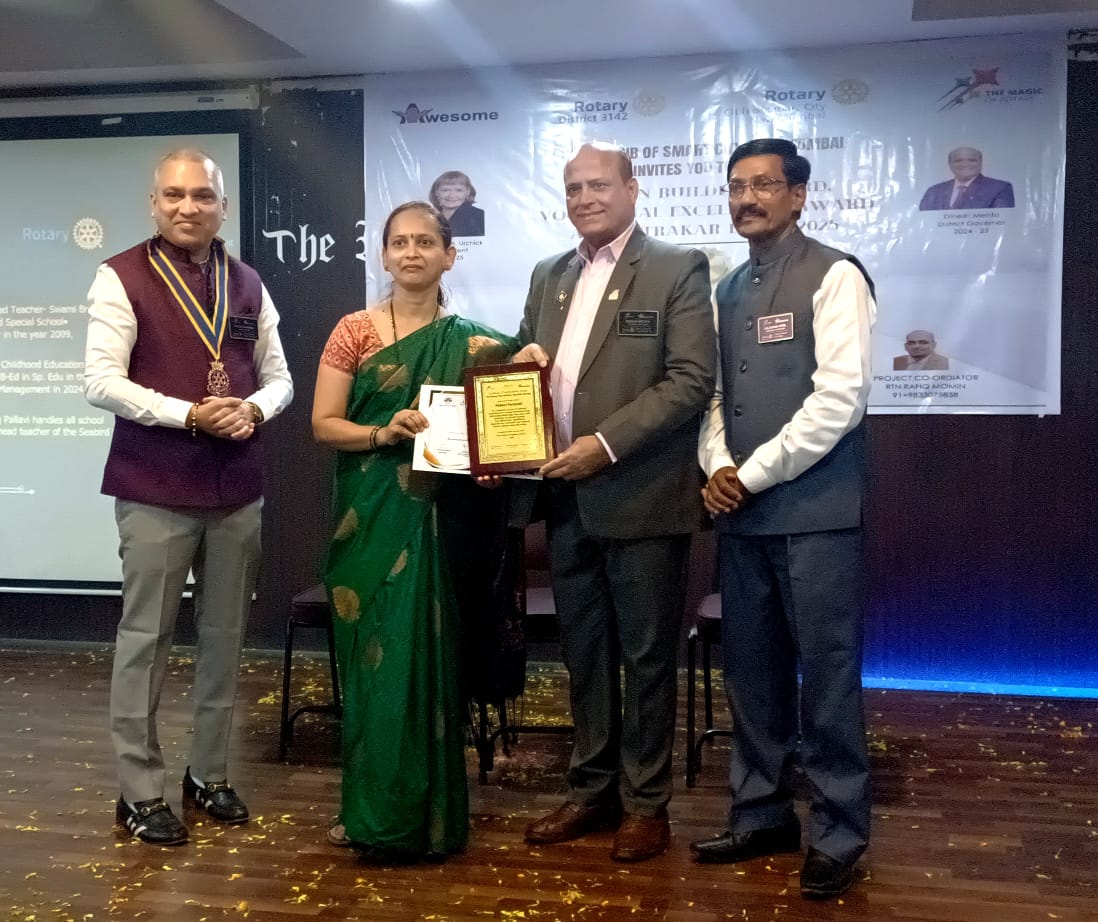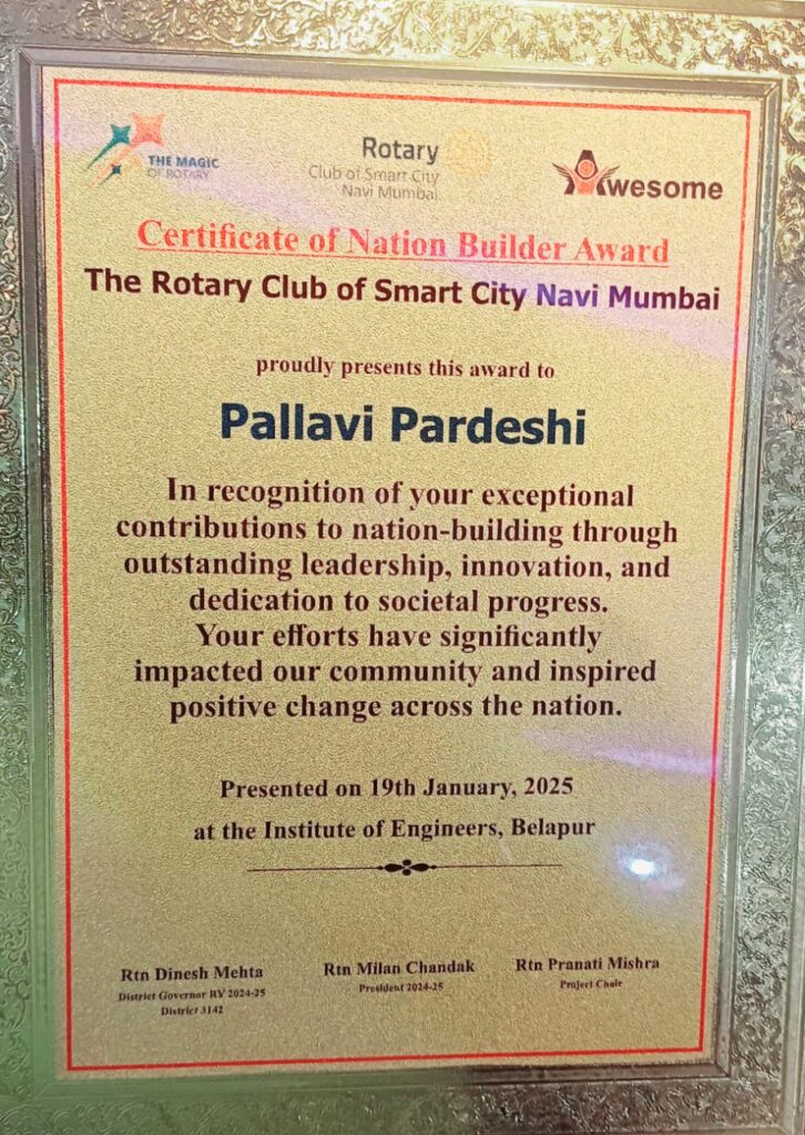 उरण : रोटरी क्लब ऑफ स्मार्ट सिटी नवी मुंबई यांच्यावतीने समाजातील राष्ट्र निर्मिती करता करण्यात येणाऱ्या कामाच्या व सेवेच्या आधारावर ‘नेशन बिल्डर अवॉर्ड’ देण्यात येत असतो. या वर्षाचा ‘नेशन बिल्डर अवॉर्ड’ उरण तालुक्यातील स्वामी ब्रह्मानंद प्रतिष्ठान सी बर्ड स्टेशन मुलांची शाळा उरण या शाळेतील मुख्य शिक्षिका पल्लवी संतोष परदेशी यांना मिळाला आहे. हा पुरस्कार मिळाल्याने पंचक्रोशीतून त्यांच्यावर अभिनंदनाचा वर्षाव होत आहे.