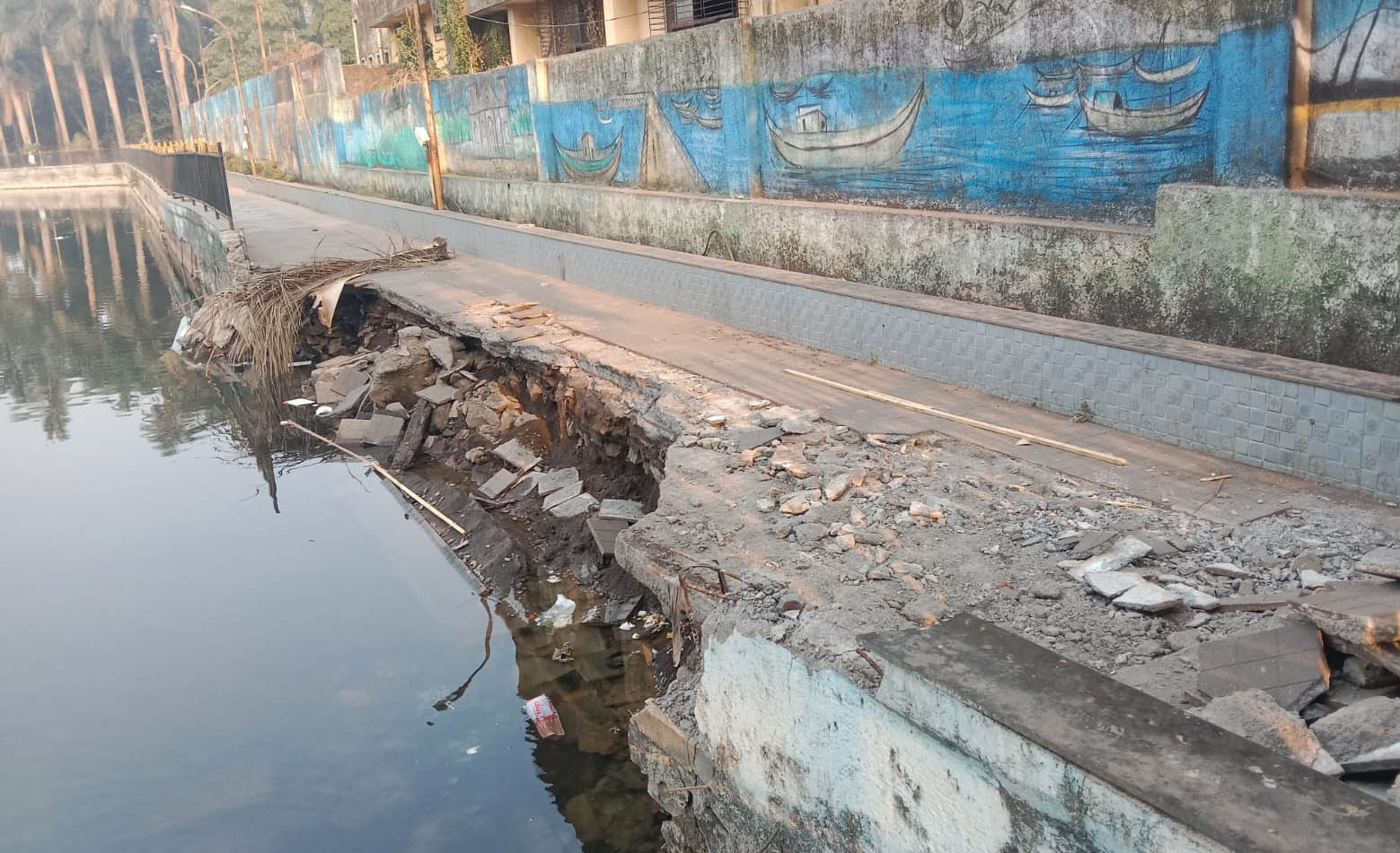 उरण शहरातील विमला तलावात जनतेला व छोट्या मुलांना खेळण्यासाठी सुरक्षित ठिकाण आहे. या ठिकाणी सकाळपासून संध्याकाळपर्यंत नागरिकांची मोठ्या प्रमाणात रेलचेल सुरू असते. त्यामध्ये प्रामुख्याने ज्येष्ठ नागरिक, तरुण मंडळी, महिला वर्ग मॉर्निंग वॉक करण्यासाठी येत असतात. तसेच काहीजण जवळचा मार्ग ये-जा करण्यासाठी याचा वापर करीत आहेत. तर लहानमुळे खेळण्यासाठी येत असतात. परंतु, हा कठडा दोन दिवसांपूर्वी कोसळला आहे. त्यामुळे संपर्क तुटत पूर्णपणे तलावाला वळसा मारुन जावे लागत आहे.
