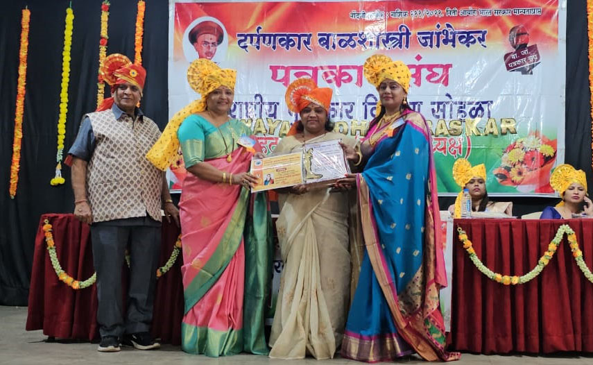 अलिबाग : दर्पणकार बाळशास्त्री जांभेकर पत्रकार संघ नाशिक यांच्या वतीने जागतिक महिला दिनानिमित्ताने आयोजित भव्य दिव्य अशा कार्यक्रमात नाशिक येथे बाळशास्त्री जांभेकर पत्रकार संघातर्फे राष्ट्रीय अध्यक्ष डॉ. महेंद्र देशपांडे यांच्या शुभहस्ते राष्ट्रीय स्वयंसिद्धा पुरस्काराने सन्मानित करण्यात आले. यावेळी मनपा नाशिक आयुक्त मनिषा खत्री, आयएएस अधिकारी लीना बनसोड, प्रगती गृहउद्योग संचालिका पूजा कदम, शिखर स्वामिनी अध्यक्षा संगीता गायकवाड आदी मान्यवर उपस्थित होते.