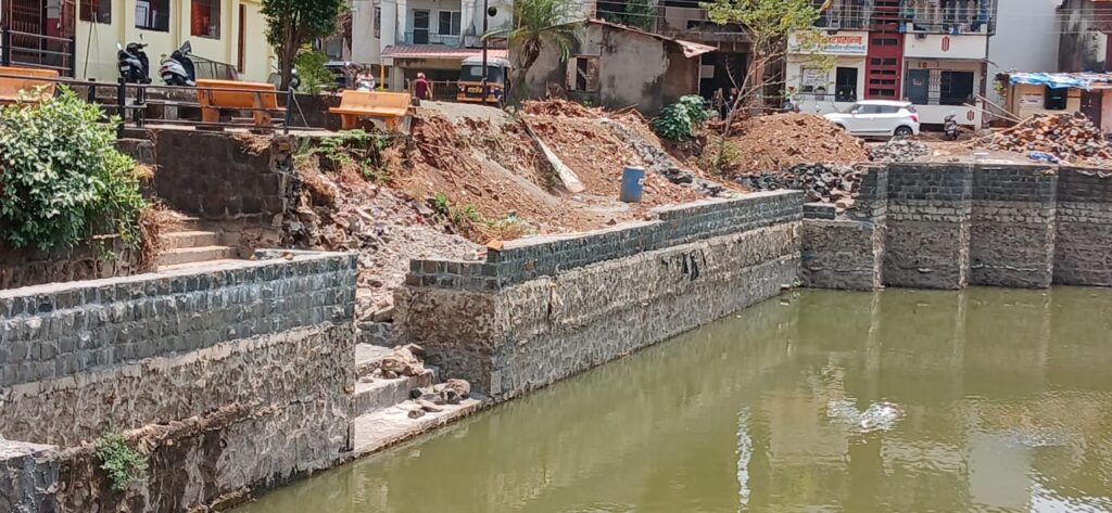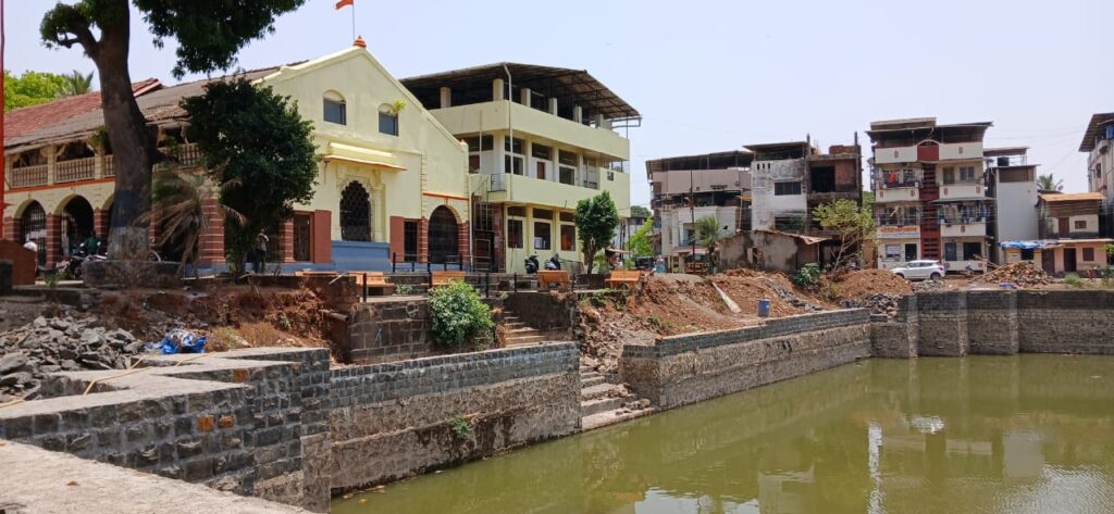 महाड : महाडचे ग्रामदैवत श्री वीरेश्वर महाराजांच्या मंदिरासमोर असलेल्या ऐतिहासिक तलावाच्या सुशोभिकरणाचे काम राज्य शासनाच्या “तलाव संवर्धन योजनेंतर्गत” करण्यांत येत आहे. मात्र हे काम आता निधीअभावी रखडल्याचे दिसून येत आहे. सदरचे काम शासनाकडून मंजुर करण्यात आलेल्या निधीपैकी ८७ लाख रुपयांचा निधी उपलब्ध झालेला नसल्यामुळे काम बंद असल्याची माहिती महाड नगरपालिचे अभियंता प्रविण कदम आणि मुख्याधिकारी धनंजय कोळेकर यांनी दिली. एकंदरीत राज्य शासनाच्या तिजोरीत खडखडाट असल्याचा फटका वीरेश्वर तलावाच्या सुशोभीकरणाला बसला आहे.