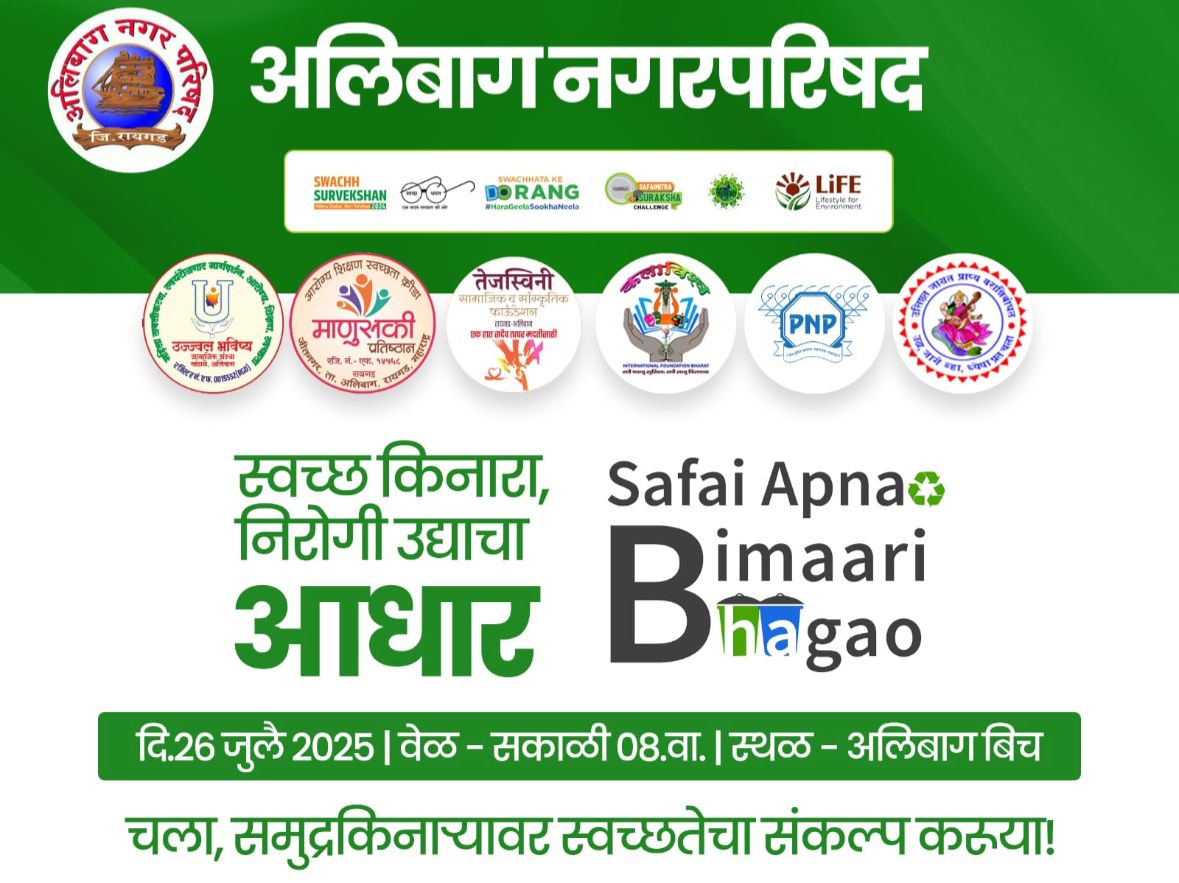 अलिबाग : “स्वच्छ किनारा, निरोगी उद्याचा आधार” या ब्रीदवाक्याला अनुसरून अलिबाग नगरपरिषदेतर्फे २६ जुलै २०२५ रोजी सकाळी ८ वाजता अलिबाग बिचवर स्वच्छता मोहिमेचे आयोजन करण्यात आले आहे. या उपक्रमाचे उद्दिष्ट आहे समुद्रकिनाऱ्याच्या स्वच्छतेसह नागरिकांमध्ये आरोग्य जागृती निर्माण करणे.