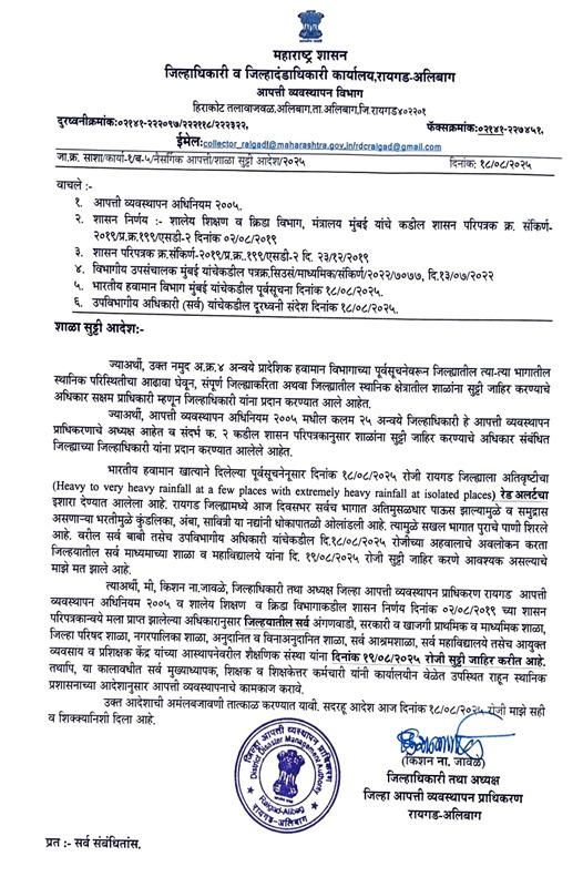 रायगड जिल्ह्यात सोमवारी दिवसभर मुसळधार पाऊस पडला. कुंडलिका, अंबा आणि सावित्री नद्यांनी धोक्याची पातळी ओलांडली असून अनेक सखल भागांत पाणी शिरले आहे. भारतीय हवामान खात्याने जिल्ह्याला मुसळधार पावसाचा रेड अलर्ट जारी केला आहे, या पार्श्वभूमीवर रायगड जिल्ह्यातील सर्व शाळा आणि महाविद्यालयांना मंगळवार, दि. १९ ऑगस्ट रोजी सुट्टी देण्यात आली आहे. रायगडचे जिल्हाधिकारी किशन जावळे यांनी याबाबतचे पत्रक जारी केले आहे.