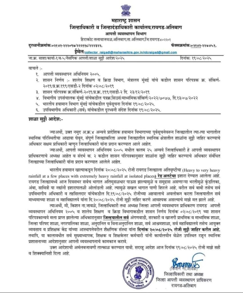 भारतीय हवामान विभागाने दिलेल्या अंदाजानुसार रायगड जिल्ह्यात काही ठिकाणी अतिवृष्टी होण्याची शक्यता वर्तवण्यात आली आहे. सलग दोन दिवसांपासून सुरू असलेल्या पावसामुळे नद्या-नाले धोक्याच्या पातळीवर पोहोचले आहेत. या पार्श्वभूमीवर खबरदारीचा उपाय म्हणून जिल्हा प्रशासनाने हा निर्णय घेतला.