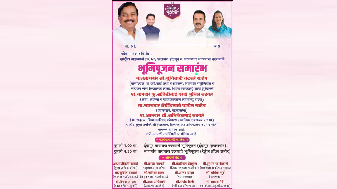 निमंत्रण पत्रिकेत भाजपचे एकमेव खासदार धैर्यशील पाटील व तटकरे कुटुंब (खासदार सुनील तटकरे, मंत्री आदिती तटकरे, अनिकेत तटकरे) यांची नावे ठळकपणे आहेत. याशिवाय राष्ट्रवादीच्या स्थानिक कार्यकर्त्यांचीच नावे दिसत असल्याने कार्यक्रमावर राष्ट्रवादीचा बोलबाला आहे.