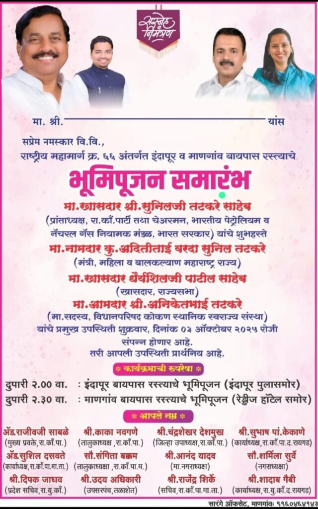 मुंबई-गोवा राष्ट्रीय महामार्ग क्रमांक ६६ वरील इंदापूर आणि माणगाव बायपासच्या भूमिपूजन कार्यक्रमावरून पुन्हा एकदा शिंदे गटाची शिवसेना विरुद्ध अजित पवार गटाची राष्ट्रवादी काँग्रेस असा राजकीय कलगीतुरा रंगण्याची चिन्हे आहेत. यावेळी निमंत्रण पत्रिकेत महाडचे आमदार व राज्याचे रोजगार हमी मंत्री भरत गोगावले यांचे नाव डावलण्यात आले असून, राष्ट्रवादी काँग्रेसचाच बोलबाला दिसून येत आहे.