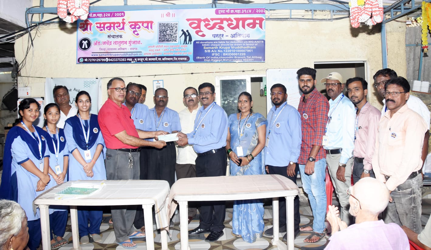 या उपक्रमांतर्गत ॲड. जयेंद्र गुंजाळ संचलित “श्री समर्थकृपा वृद्धाश्रम, परहुर (ता. अलिबाग)” या संस्थेला ₹२५,०००/- इतक्या डिमांड ड्राफ्टद्वारे आर्थिक सहाय्य करण्यात आले. हा डिमांड ड्राफ्ट संस्थेचे व्यवस्थापक वैभव बोर्लीकर यांच्या हस्ते वृद्धाश्रमास प्रदान करण्यात आला.