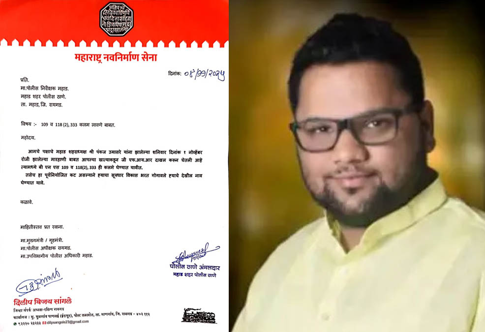 मनसेचे जिल्हा संपर्क प्रमुख दिलीप सांगळे यांनी आपल्या लेखी पत्रात म्हटले आहे की, “महाड शहराध्यक्ष पंकज उमासरे यांच्यावर झालेला हल्ला हा पूर्वनियोजित कट आहे. या कटाचा सूत्रधार विकास भरत गोगावले असून, त्याच्यावर बी.एन.एस. कलम १०९, ११८(२) आणि ३३३ अन्वये गुन्हा दाखल करण्यात यावा.”