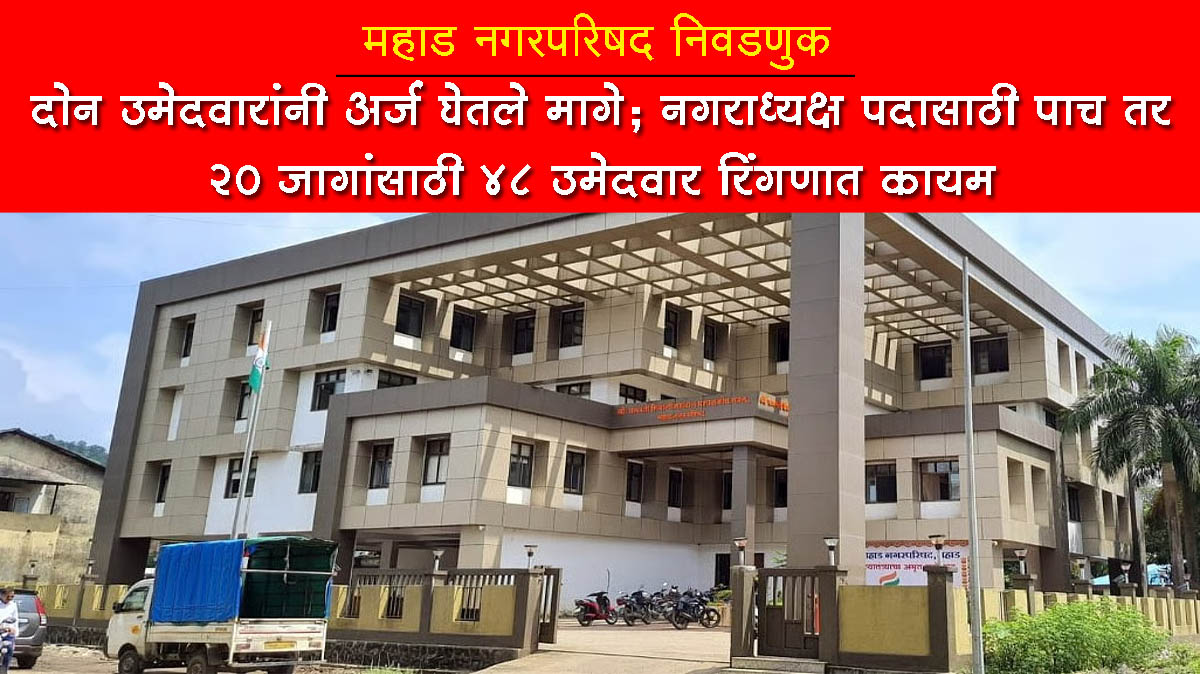 स्थानिक स्वराज्य संस्थांच्या पहिल्या टप्प्यातील नगरपरिषद निवडणुकीसाठी अर्ज छाननीनंतर उमेदवारी अर्ज मागे घेण्याची अंतिम मुदत २१ नोव्हेंबरला संपली. शेवटच्या दिवशी महाड नगर परिषदेसाठी दोन उमेदवारांनी माघार घेतल्याने नगरसेवक पदासाठी २० जागांसाठीची उमेदवार संख्या ५० वरून ४८ वर कमी झाली आहे. तर नगराध्यक्ष पदासाठी दाखल झालेले सर्व ५ उमेदवार अंतिम यादीत कायम असल्याची माहिती निवडणूक निर्णय अधिकारी व तहसीलदार महेश शितोळे तसेच मुख्याधिकारी धनंजय कोळेकर यांनी दिली.