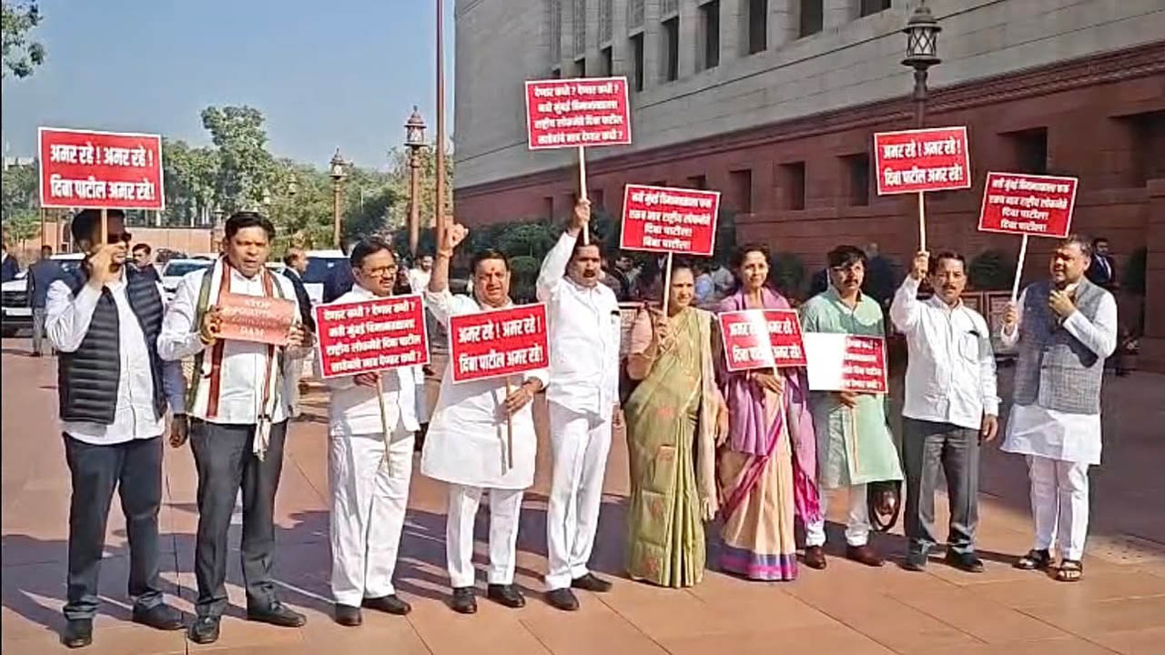 संसदभवनाबाहेर “दि. बा. पाटील साहेबांचा सन्मान अबाधित ठेवा!”, “भूमिपुत्रांचा अपमान सहन करणार नाही!” अशा घोषणांनी परिसर दणाणून गेला. महाराष्ट्रातील सर्वपक्षीय खासदारांचा एकमुखी निर्धार पाहता केंद्र सरकारने हा मुद्दा तातडीने निर्णय प्रक्रियेत आणावा, अशी मागणी निदर्शनांतून करण्यात आली.